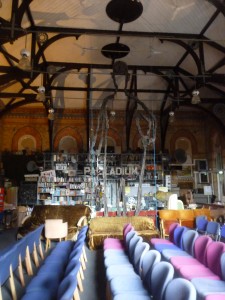 Today I went to visit London’s best kept secret: The Cinema Museum. P1060245Having lived in London for many years, I have heard about this place, but for some reason never been. It is hidden away in Lambeth in an old workhouse where Charlie Chaplin lived as a child, when his mother faced destitution. P1060241The main room is spectacular (the former Workhouse Chapel) and divided into 2 sections: 1 half is a really funky bar full of film memorabilia:P1060237